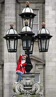 The 49-year-old father of two scaled the palace gates and chained himself to the top of a 6m pillar, from where he spent the next two hours, dressed as Santa Claus, shouting fathers' rights slogans.