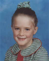 Karen has straight brown hair, blue eyes and is about 120 centimetres tall and of solid build.