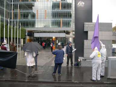 1 April 2004An 'April Fools' day where decontaminating the Family Court in Melbourne was the order of the day. Dressed in decontamination suits they bid good riddance to Alistair Nicholson the departing Chief Judge of the Family Court of Australia.